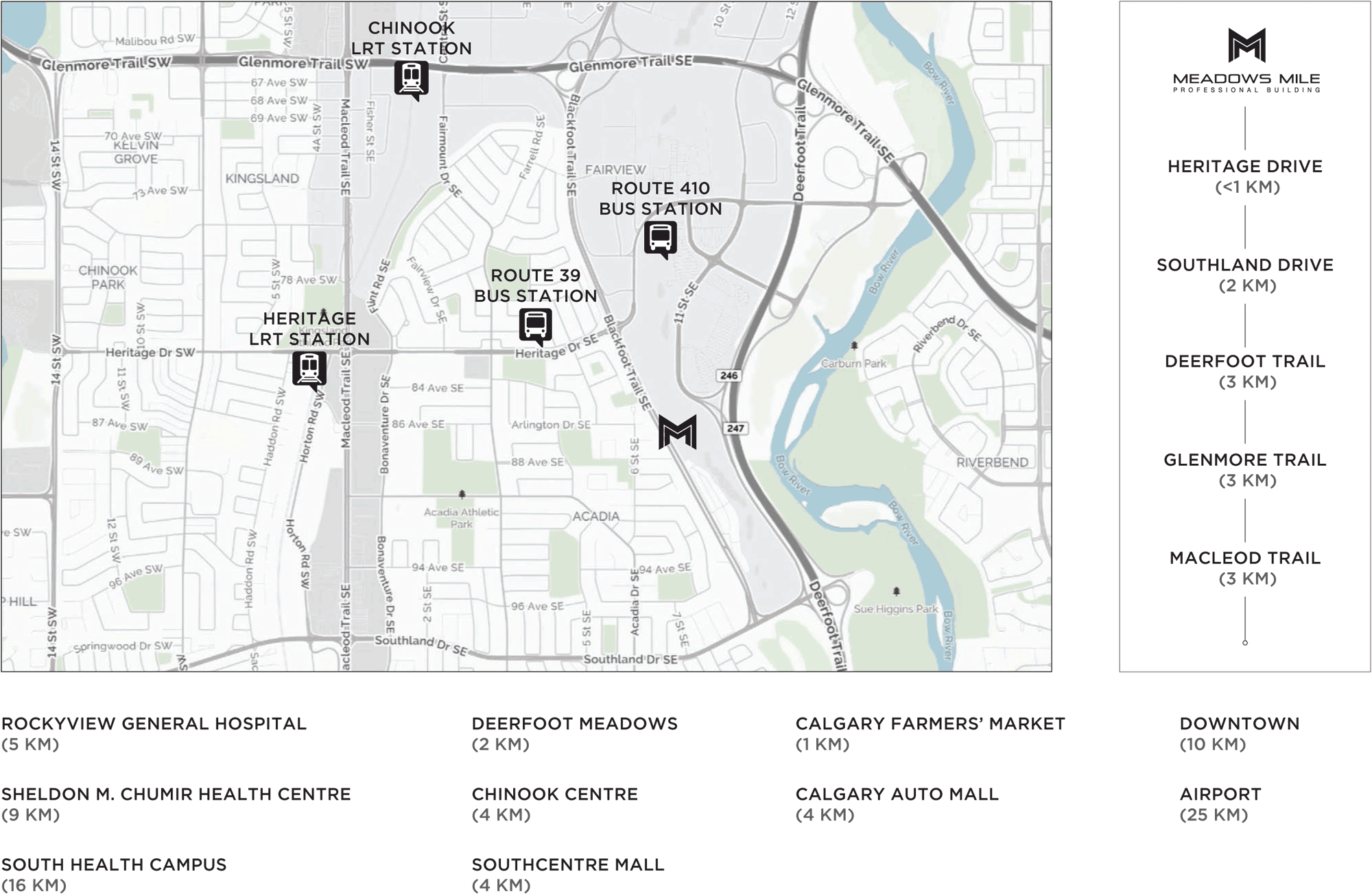 - Automobile: Via Major Thoroughfares Deerfoot Trail, Glenmore Trail, Heritage Drive, MacLeod Trail, and Southland Drive